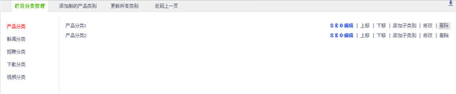 管理网站栏目分类,点击左则可以选择栏目,在右则可以对所属的栏目(SEO编辑(详细【3.4.1】章节进行介绍)、上下移动、添加子类别,修改,删除)。
