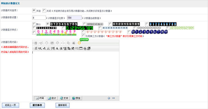 启用网站计数器功能,可以您查看您网站被人访问的次数。目前系统的计数器,运行稳定、显示速度快、12种丰富计数器图片样式提供选择。翼企魔方提供开放第三方接口,选择 ,可以在“计数器引用代码”字段里添加第三方计数器。